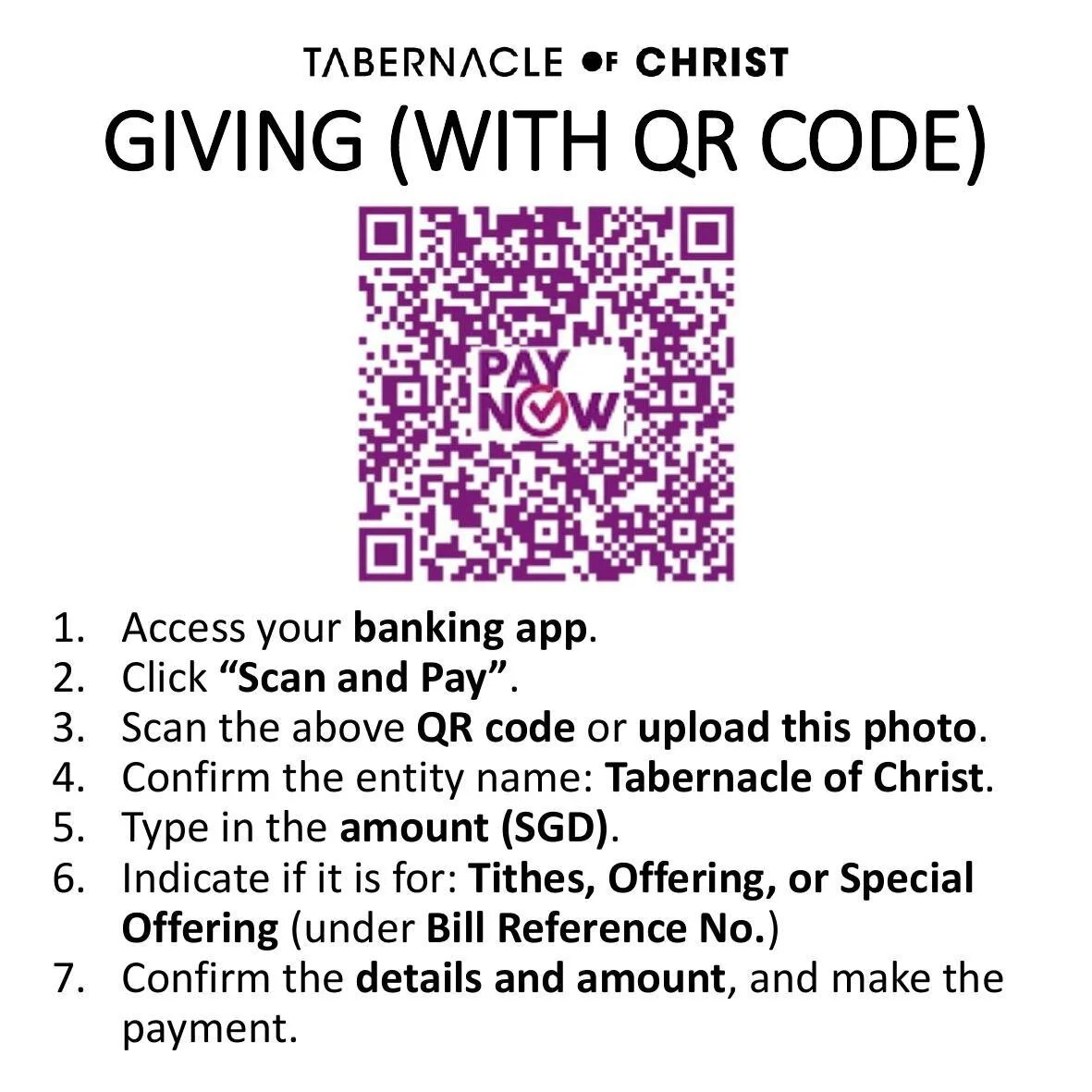 If you would like to bless our ministry financially, kindly scan the PayNow QR code below in your banking app, and specify the amount you would like to donate.